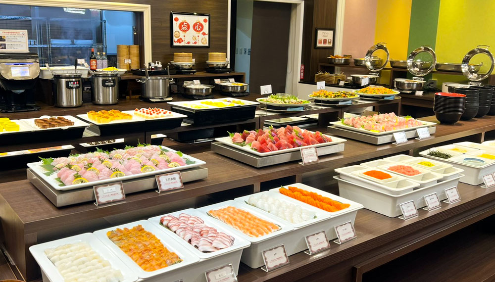朝食もビュッフェ形式で、焼き魚、卵料理、パン、フルーツなど種類豊富。