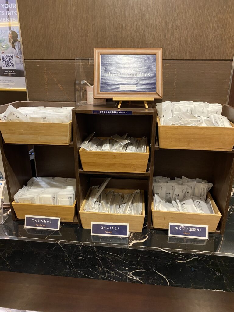 メルキュールホテルはフロントの横にアメニティが置いてあるので必要な分だけピックアップします。